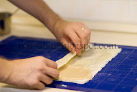 4. Se desfac cu grija doua foi de placinta, se ung cu unt topit si se suprapun. Se indoaie pe urma pe verticala in doua, se ung cu unt. Se toarna 3 linguri de compozitie pe treimea de jos a foilor. Se impatura pe verticala de la stanga si de la dreapta foile inspre centru, astfel incat doar sa se atinga si sa nu se suprapuna lateralele. Se ung cu unt laturile proaspat indoite. Se indoaie treimea de jos in sus si se unge cu unt. Treimea de sus se indoaie in jos si se unge cu unt. Se formeaza prin procedeul acesta un plic cu umplutura. Se mai ung cu unt laturile plicului.