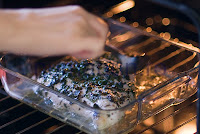 Preparare: 1. Se spala pieptul de pui si se sterge cu prosoape de bucatarie. 2. Se unge cu ulei de masline, se sareaza, pipereaza si apoi se pun pe el ierburile tocate marunt. Se pune intr-un vas de cuptor cu 2 linguri ulei de masline si putina apa (cam 50ml). 3. Se pune la cuptorul incins la 230 grade Celsius neacoperit si se lasa cam 40-50 de minute. E important ca din 10 in 10 minute sa deschideti usa cuptorului si cu o lingura sa luati din zeama din vas si sa presarati pe carne (ajuta la pastrarea fragezimii si impiedica uscarea carnii). In caz ca nu mai este apa in vas, se poate adauga putina apa fierbinte (tot cam 50 ml). Atentie sa nu va ardeti in timpul procedurii acesteia foarte riscante :). 4. Sunt doua modalitati de a testa cand carnea e facuta: a) termometrul de bucatarie inserat in partea de mijloc cea mai groasa a carnii sa arate 70 grade Celsius (modalitatea aceasta e mai eleganta pentru ca nu afecteaza carnea in nici un fel) b) se taie carnea la mijloc si se observa culoarea (trebuie sa fie alba). Se scoate de la cuptor cand e gata si se mai lasa 10 minute in vas (in timpul acesta carnea inca se mai gateste). 5. Cat timp e curcanul la cuptor se poate pregati o garnitura de cartofi natur astfel: se spala si se curata cartofii si ceapa, se taie cartofii cubulete. Se pune apa la fiert, cand e fiarta se pun 2 lingurite de sare, cartofii, ceapa, bouquet garni-ul si se lasa la foc mediu cam 30 minute. Cartofii sunt fierti cand furculita intra usor in ei. 6. Curcanul se poate servi cu sos de ciuperci. Secretul gustului e sa puneti ierburi proaspete si nu uscate si mai ales sa puneti mult busuioc :) Tot la obtinerea unui gust mai bun ajuta si daca in reteta se substituie apa in care se gateste curcanul cu supa de pui. |