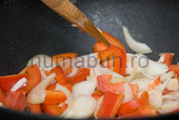 4. Se incinge in wok inca o lingura de ulei si se caleste ceapa, ardeiul si ghimbirul. Dupa circa 5 minute se adauga si usturoiul si se mai lasa cam 1 minut la prajit.