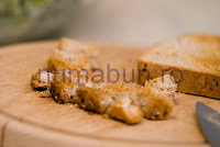 Se pune uleiul si iaurtul peste salata si se amesteca bine pentru omogenizare. Se prajesc feliile de paine la toaster, se taie cubulete si se adauga la salata.