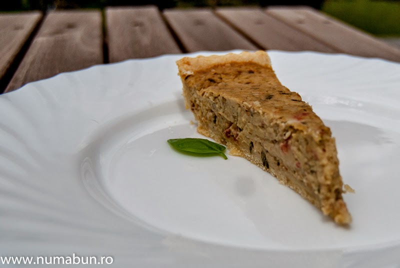 4. Intr-un bol se bat ouale ca si pentru omleta, se adauga vinetele, rosiile, nucsoara, smantana lichida, busuiocul, sare, piper. Se toarna compozitia in tava de tarta pre-coapta. Se baga la cuptor 30-40 minute pana s-a inchegat.