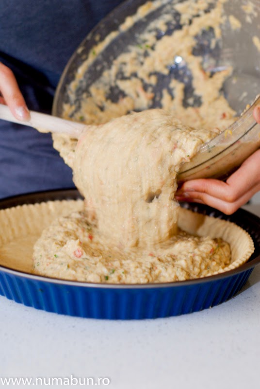 2. Se prepara aluatul. In vasul robotului se pune faina, sarea, zaharul, untul si se pulseaza de 10 ori, pana ia forma de biscuiti sfarmati. Se adauga apa si se pulseaza la robot de 10-15 ori pana se leaga aluatul (incepeti cu putina apa si apoi adaugati daca mai trebuie). Se rastoarna aluatul pe o folie de silicon si se intinde in forma de cerc de 30 cm diametru (pentru tava de diametru 28 cm). Se pune tava de tarta cu fundul in sus pe cercul de aluat si cu o miscare rapida si ferma se intoarce folia de silicon impreuna cu tava, astfel ca tava sa fie acuma jos si folia sus. Se desprinde cu grija si se aranjeaza in tava. Se taie surplusul de pe marginile tavii. Se pune la frigider 30 minute.